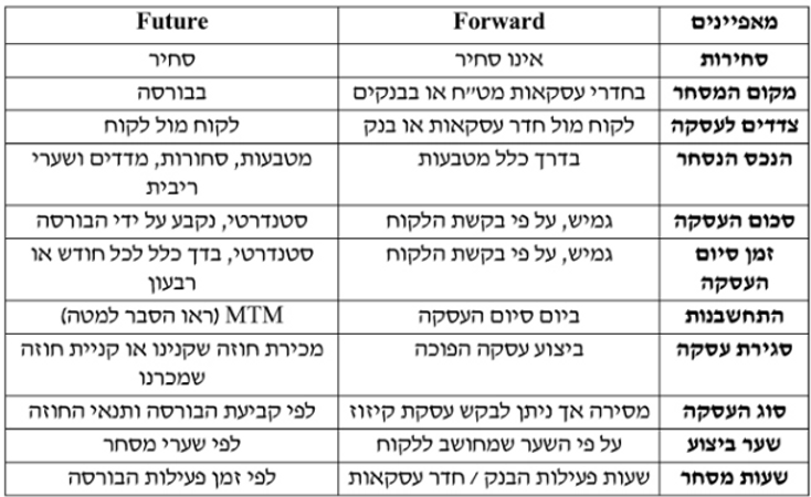 - חוזה FORWARD – חוזה ייחודי שנוצר בהתאמה אישית ללקוח דרך ברוקר / בנק / בית השקעות ואינו נסחר בבורסה.