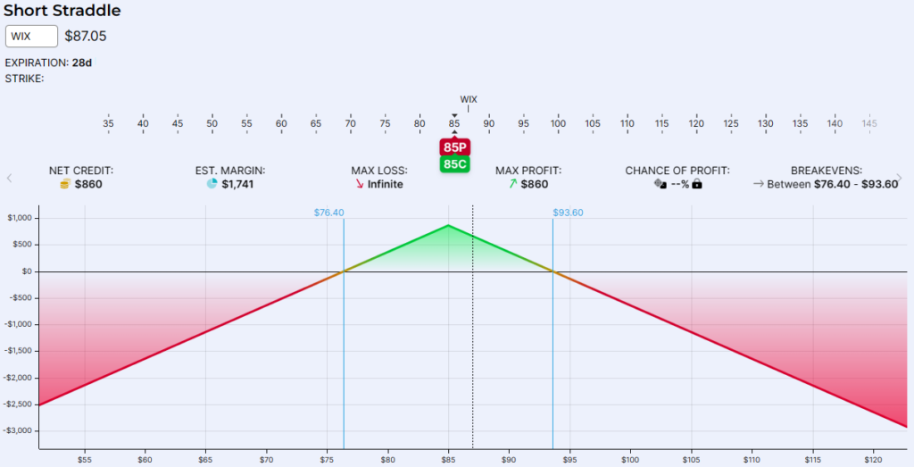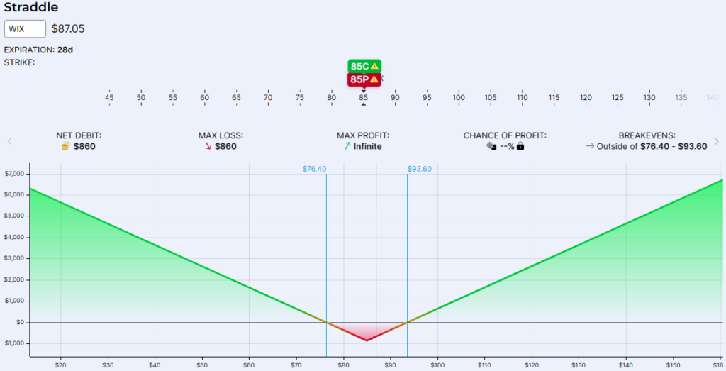 נמשיך את הדוגמה של WIX ונאמר שאנחנו צופים ליציבות במחיר המניה לחודש הקרוב, שאנחנו לא מצפים שהיא תזוז יותר מידי. אם כך, נכתוב את ה STRADDLE לסטרייק 85$ לחודש הבא.