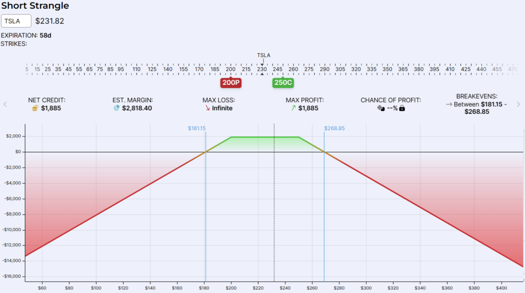 נכתוב STRANGLEים כאשר אנחנו מצפים ליציבות בטווח מסוים במניה. כלומר, נאמר שאנחנו מצפים ליציבות (ירידה בתנודתיות, המשך הליכה בטווח מסוים) בחודשיים הקרובים במניית TSLA כך שתמשיך לנוע בטווח של 200$ ל 250$. במילים אחרות, נאמר שאני מאמין ש TSLA לא תעלה יותר מ 20$ ולא תרד יותר מ 30$ בחודשיים הקרובים. אם כך, אוכל לפתוח פוזיציית SHORT STRANGLE ולקבל פרמיה של 1885$ כמתואר בגרף הפקיעה.