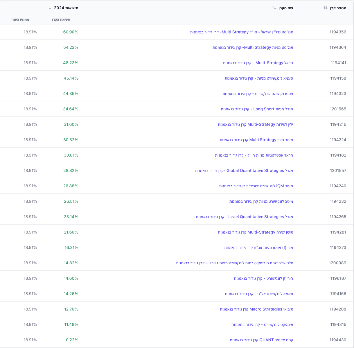 כדי להבין את הפוטנציאל של קרנות גידור בנאמנות, כדאי לבחון כמה דוגמאות בולטות מהשנה האחרונה. שתי הקרנות המובילות ב 2024 היו של בית ההשקעות אנליסט, בניהולו של שמואל לב. הקרן “אנליסט נדל”ן ישראל-חו”ל מולטי סטרטג’י” בלטה עם תשואה מדהימה של 60.9% במהלך השנה, בעוד ש”אנליסט מניות מולטי סטרטג’י” רשמה תשואה מרשימה של 54.2%.