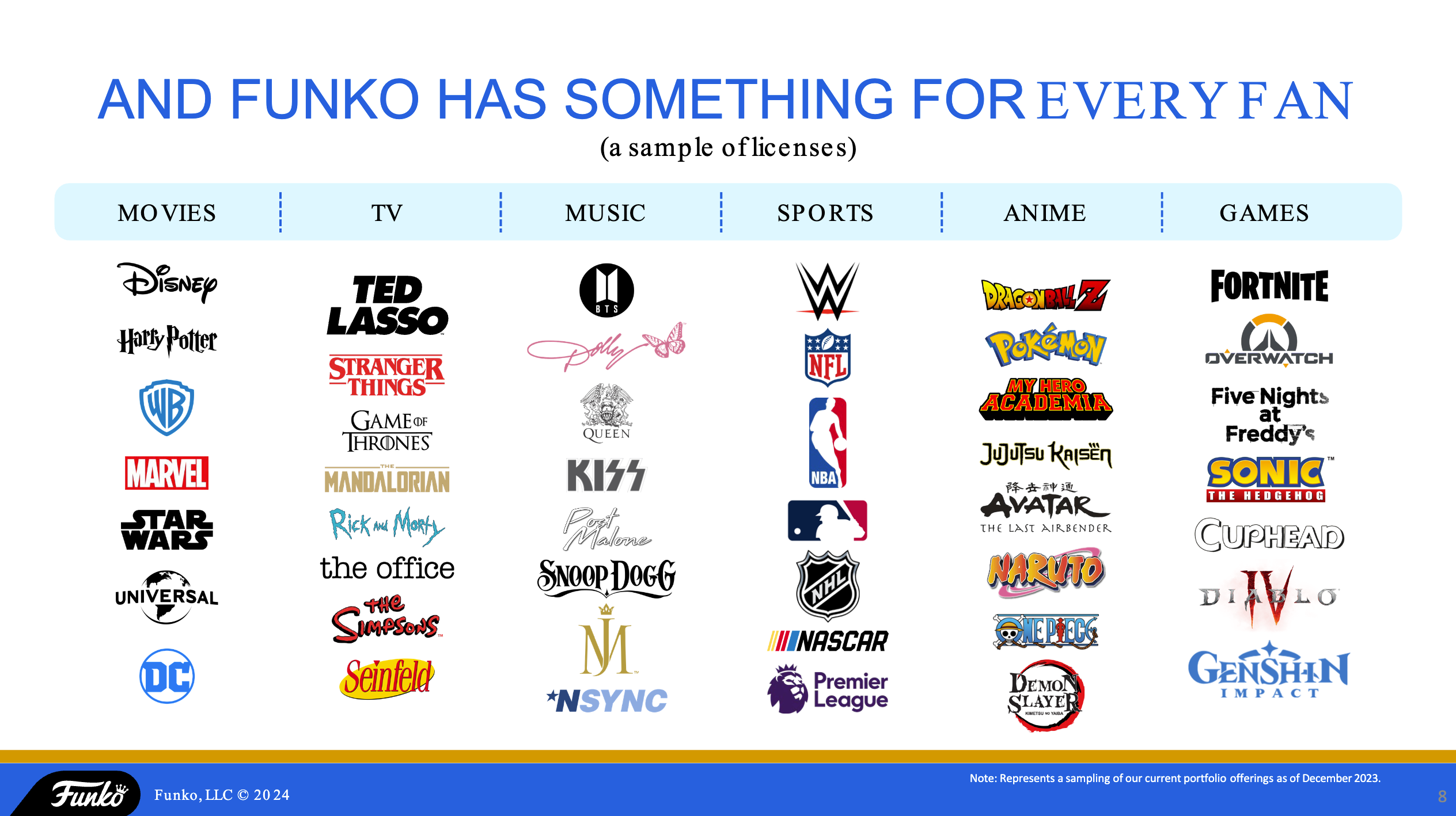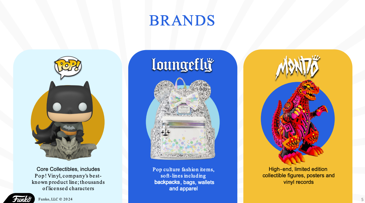 פונקו, שהוקמה ב 1998, התפתחה לאורך השנים למותג מוביל בתחום מוצרי תרבות הפופ, עם מגוון רחב של מוצרים הכוללים בובות, צעצועים, אביזרים ועוד. החברה מתמקדת ביצירת מוצרים במחירים נגישים יחסית, בדרך כלל מתחת ל 15 דולר, מחיר יחסית נוח. על פי הערכות ההנהלה, כשליש מלקוחות החברה הם חובבי פופ ושליש נוסף הם אספנים הרוכשים את מוצרי החברה באופן קבוע ונוטים יותר להשתתף במכירות של מהדורות מוגבלות. זהו קהל יעד נאמן ומחויב, המהווה בסיס איתן לצמיחת החברה.